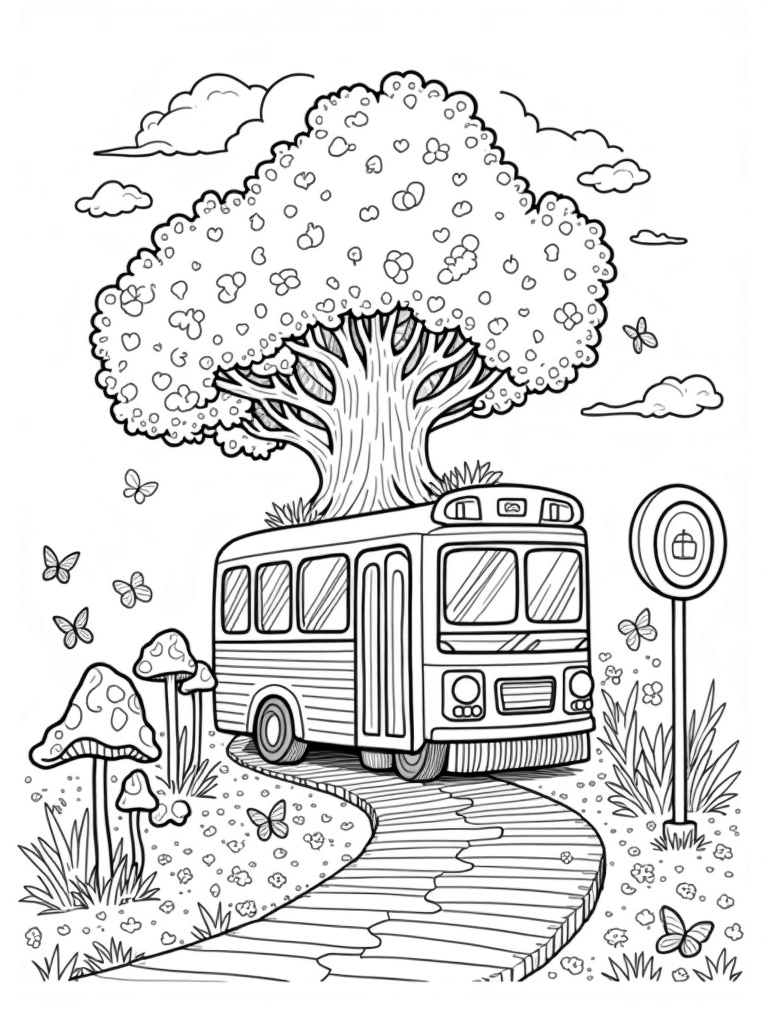 Check out this free, printable coloring page featuring a whimsical tree-shaped bus, colorful canopies, and fun mushrooms. Perfect for kids who love buses and nature, this delightful design is sure to spark creativity during coloring time!