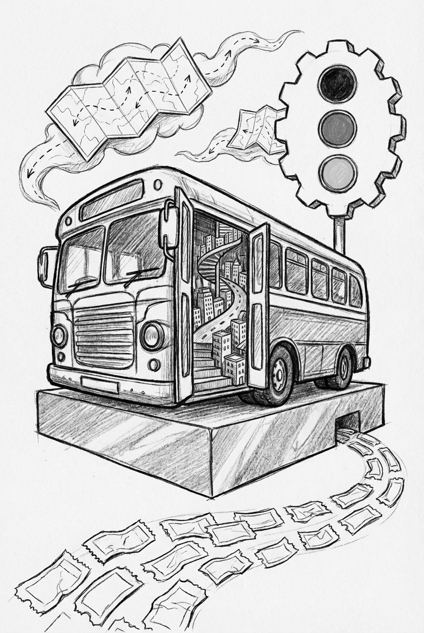 A giant vintage bus sits on a smooth marble pedestal. Its doors are wide open, revealing a never‑ending staircase made of tiny city blocks that seem to climb up into the sky. Above the bus, a whimsical cloud‑like sky is filled with floating bus‑route maps, each one a little piece of paper drifting lazily. To one side a massive gear‑shaped traffic light glows with the classic red, yellow, and green lenses, and at the bottom a slow‑moving river of torn ticket stubs winds away from the base.