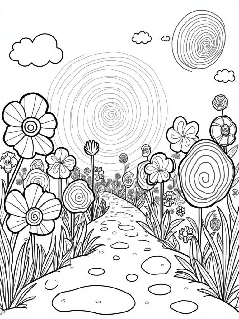In the background, a sun made of concentric circles beams down, spreading warmth and joy throughout the scene. Fluffy cloud-like circles float lazily above, adding to the playful atmosphere of this delightful garden. It’s the perfect setting for kids to unleash their creativity and fill it with vibrant colors!