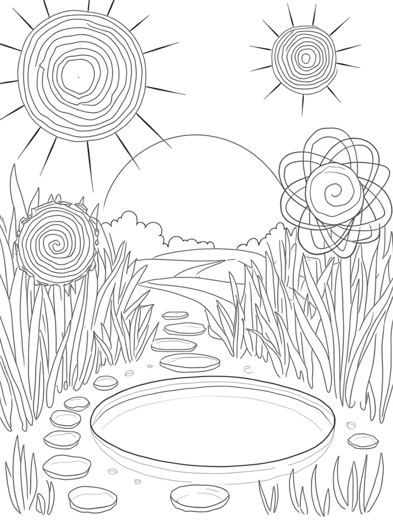 In this delightful garden, you'll find oversized, vibrant circles that look just like flowers, each one bursting with unique patterns and textures. Right in the middle, a giant sun-shaped circle beams down with rays made of interlocking spirals, creating a warm and inviting atmosphere. Beneath it, circular stepping stones lead you on a winding path, guiding you to a peaceful pond that mirrors the sky above.