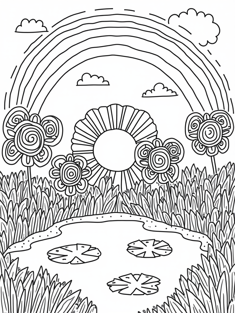 This delightful scene brings a garden to life with oversized, colorful circles that look just like flowers. Each circle has its own unique patterns and textures, inviting little artists to get creative! In the center, a big sun made of concentric circles shines brightly, spreading warmth and cheer. Follow the winding path made of smaller circles that leads to a charming pond, where lily pads float, each shaped like a different circle. The fluffy cloud circles in the sky drift lazily next to a vibrant rainbow, creating a truly magical atmosphere.