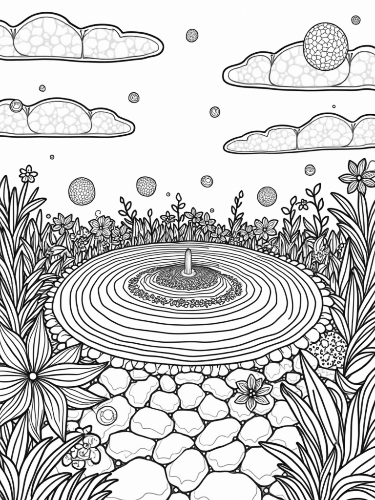 As you color, take your time with the whimsical stepping stones that lead to an ornate sun-shaped fountain. Watch the water cascade in gentle arcs, inviting you to imagine the sounds of nature around you. Don’t forget to have fun with the quilt-like sky filled with circular clouds, each with its own texture and design. There’s so much to fill in and bring to life!