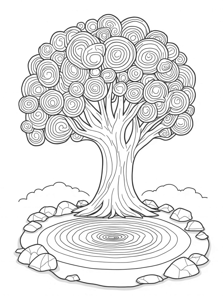 Above the tree, a cascade of floating orbs of various sizes drifts lazily, casting playful shadows on the ground. It adds a magical touch to the scene! Scattered around the base of the tree are geometric stones, each one etched with different circular designs. They create a lovely circular landscape that ties everything together, perfect for some creative coloring!