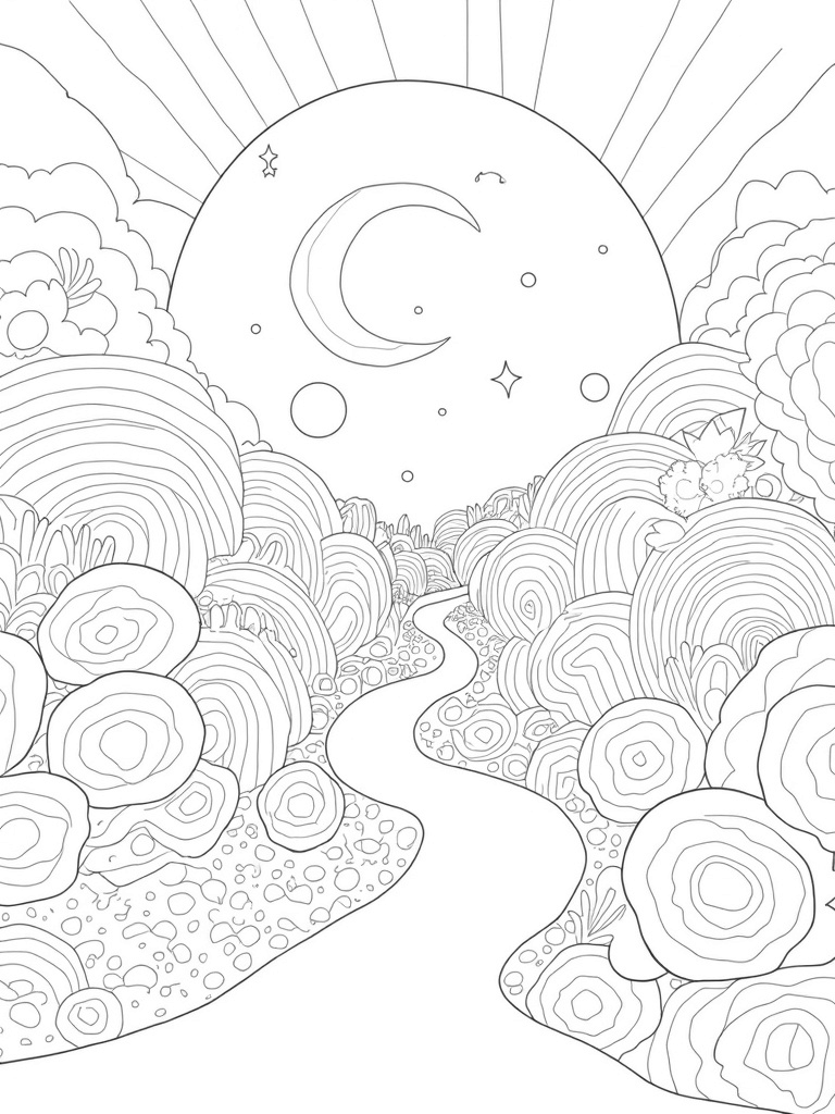 As you follow the winding path made of smaller circles, keep an eye out for the floating bubble-like orbs that reflect a rainbow of colors. In the background, there's a stunning sun-shaped circle shining bright, sending out warm beams of light. And don't forget the crescent moon circle cradling tiny stars—what a perfect nighttime scene! Take your time with the details, and enjoy adding your own flair!