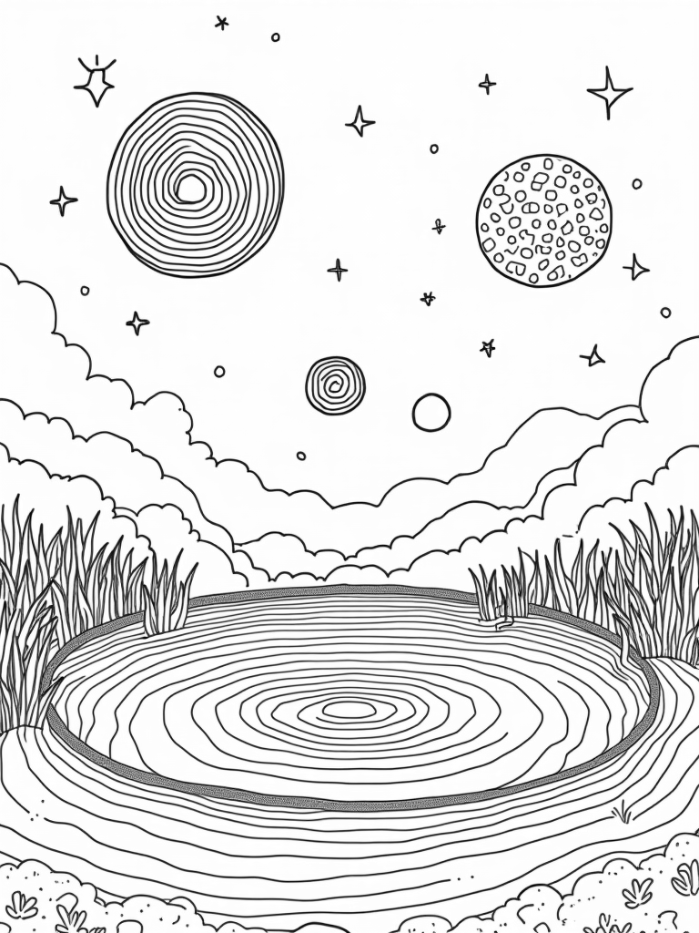 Check out this free, printable coloring page featuring a cosmic garden of oversized circles! Perfect for kids, this fun design lets little artists bring their creativity to life with different patterns and a peaceful pond scene.
