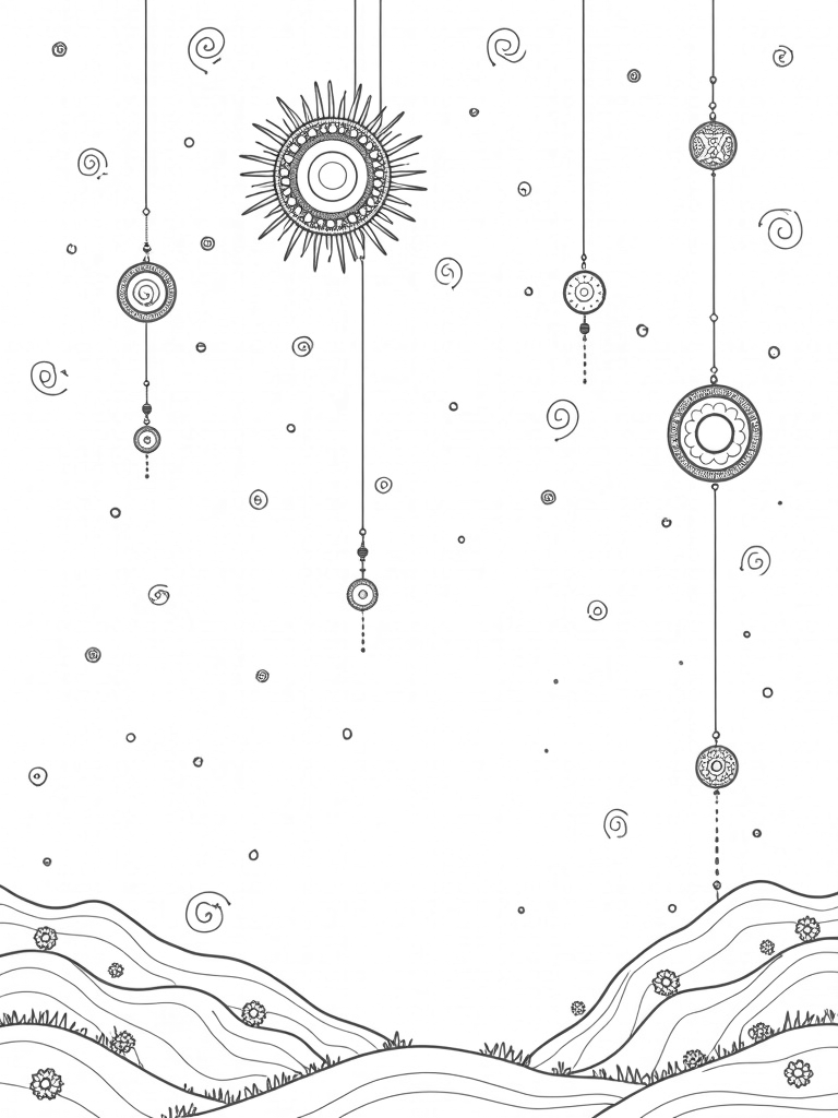 At the bottom of this cosmic garden, you’ll find a cute landscape of rounded hills. Tiny, spiraled flowers pop up around the hills, adding a splash of fun to the scene. Smooth pebbles are scattered around, mimicking the circular shapes above. It’s like nature and magic came together to create something truly special. Get ready to bring this enchanting garden to life with your favorite colors!