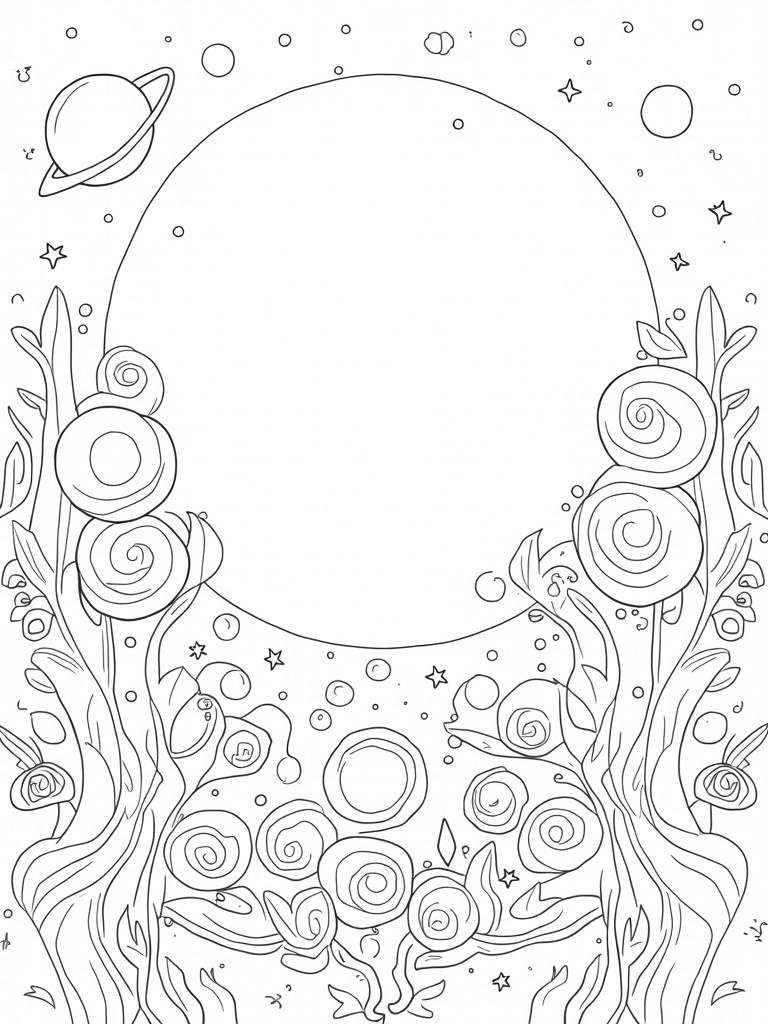 Cosmic Garden with Celestial Bodies and Flowers Coloring Page