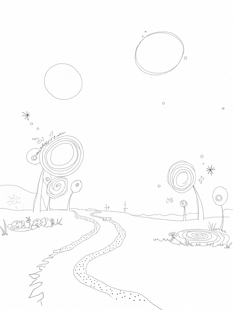 Imagine a garden that's out of this world! In this cosmic garden, giant, swirling circles float above the ground, just like colorful planets. Below them, you'll find oversized flowers with circular petals that bloom in brilliant patterns. Their centers look like kaleidoscopes, bursting with color and shapes. It’s a vibrant scene that’s sure to spark the imagination!