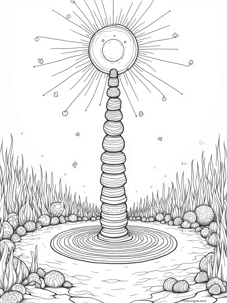 Imagine a magical garden that’s out of this world! In the center, there’s a spiraling column made of concentric circles, each decorated with beautiful, delicate patterns. Surrounding this column, a ring of colorful pebbles creates a perfect circle. Each pebble is uniquely designed, adding a splash of fun to the scene. Above it all, oversized orbs float effortlessly, casting intricate shadows on the ground below.