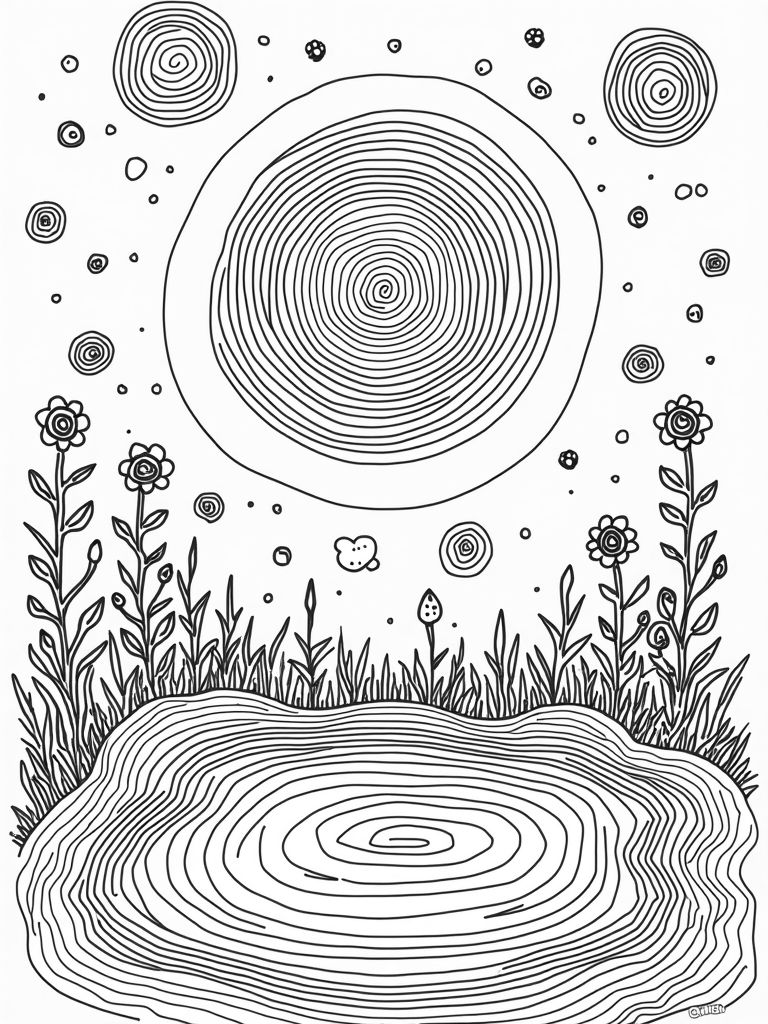 In the foreground, there's a serene pond made up of concentric circles. It's like a magical mirror reflecting all the energy and joy from the cosmic garden. You can almost hear the gentle ripples, can't you? The spiral vines wrapping around the edges add a whimsical touch, and those little circular flowers blooming outward just ask for your favorite colors to bring them to life.