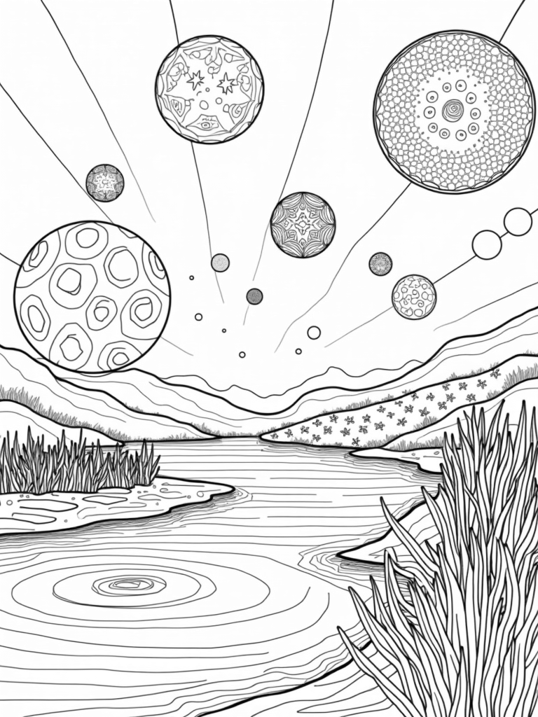 This coloring page isn’t just about filling in colors; it’s about letting your creativity shine! You can choose any colors you like for the circles and patterns. Maybe you want to make the lake a bright blue or give the plants a rainbow twist. Whatever you decide, it’s all about having fun and expressing yourself!