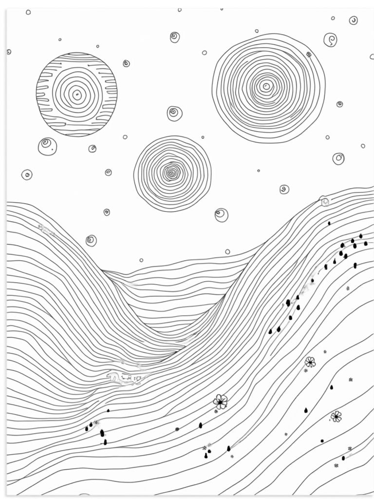 Dreamy Landscape of Floating Circles and Mandalas Coloring Page