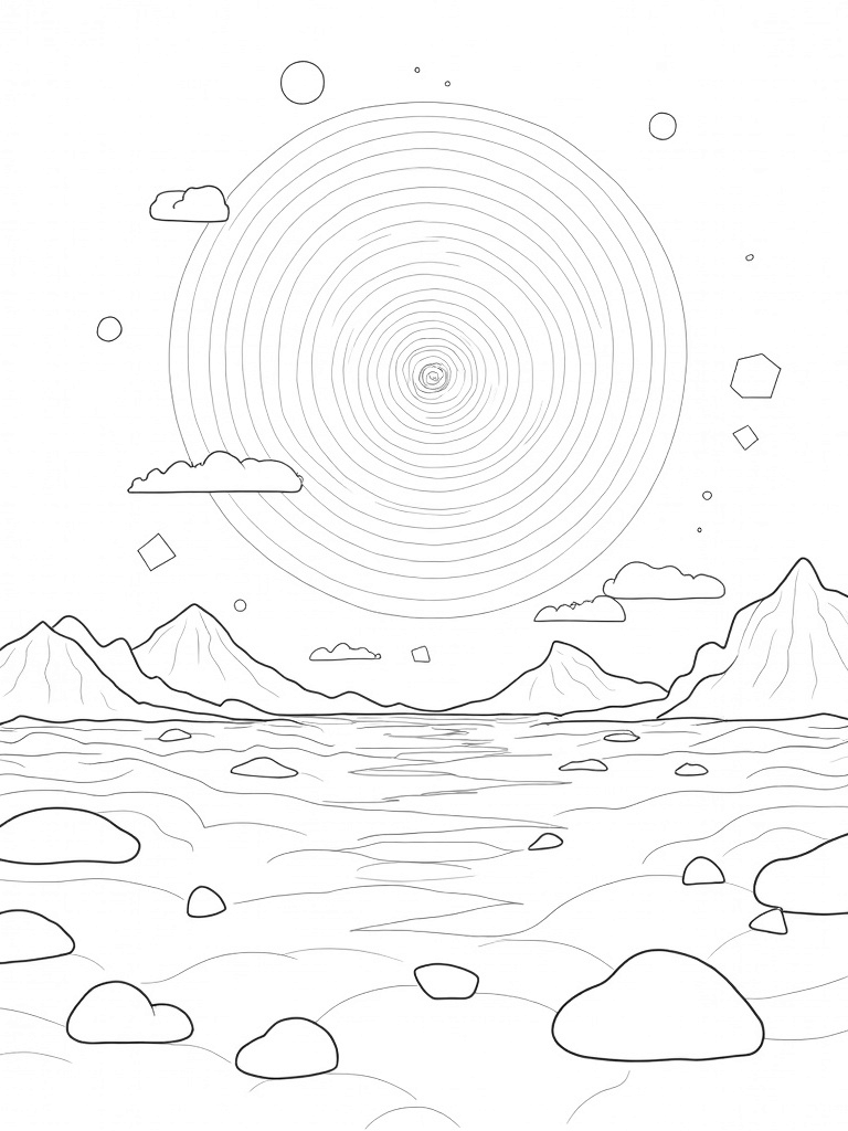 Dreamy Mandala Landscape with Floating Shapes Coloring Page