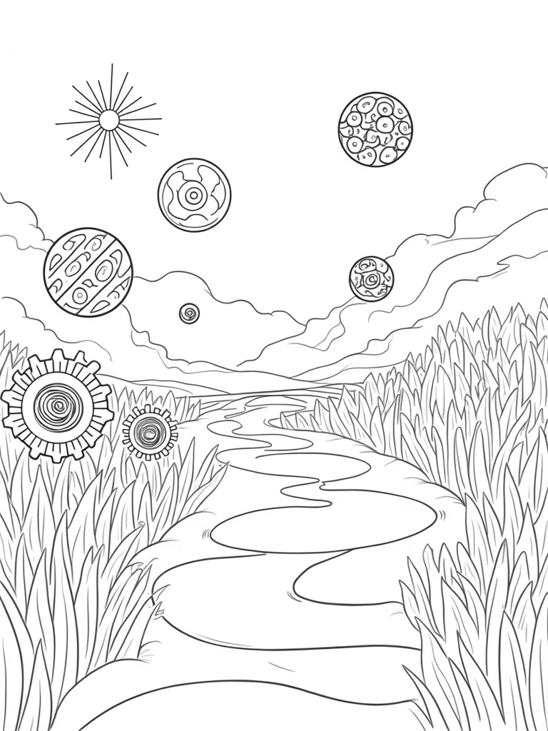 This vibrant garden is filled with oversized circles that look like they're floating in mid-air! Each circle has its own unique pattern and texture, making the scene super fun to color. Below, a winding pathway made of concentric circles invites you to explore. You can almost hear the gentle spinning of a giant circle made of interlocking gears nearby, adding a rhythmic touch to the whole place.