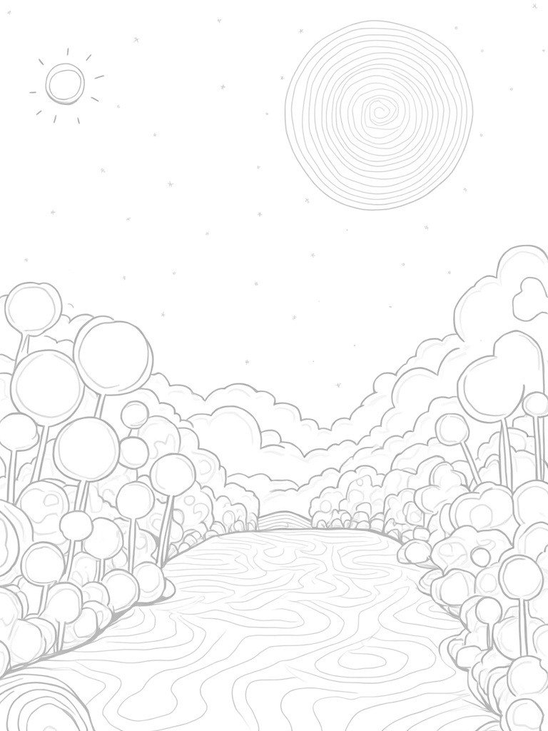 This illustration is bursting with oversized circles that float in the sky like colorful balloons. You’ll see gentle circular bushes swaying in the breeze, each leaf perfectly round. Below, a winding path made of concentric circles leads you to a tranquil pond, where the water ripples with lovely circular patterns.