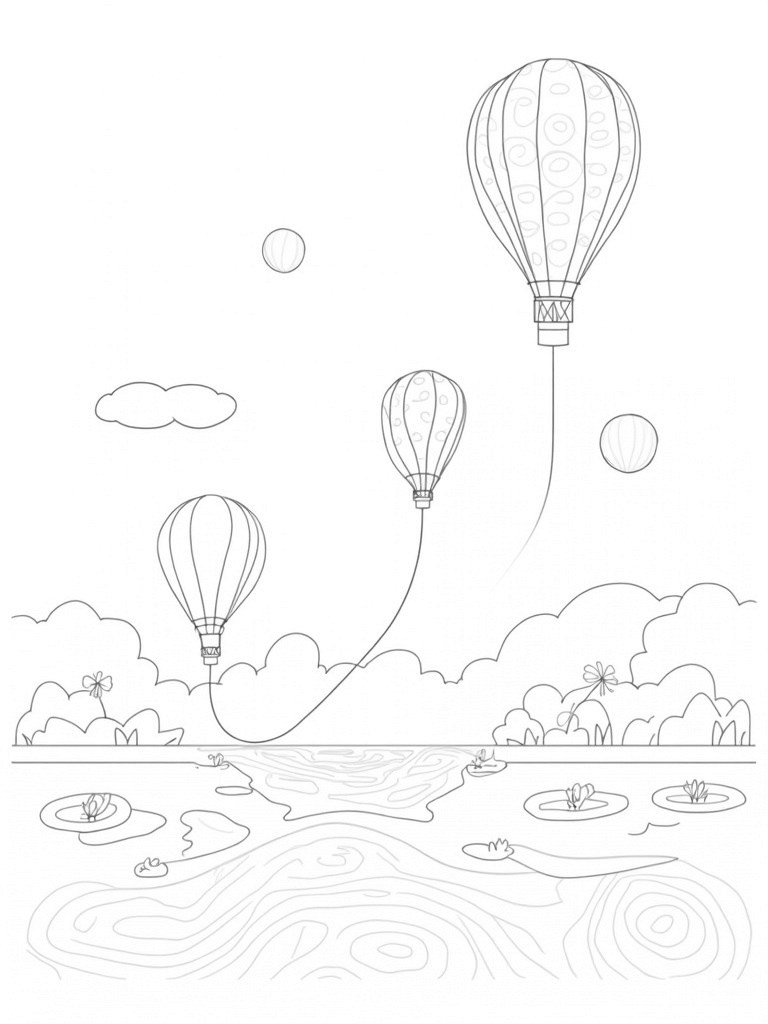 Imagine a sky filled with giant, colorful circles that look just like hot air balloons! These oversized shapes are all different sizes and patterns, floating high above a serene pond. The water below reflects the vibrant colors above, creating a beautiful scene. Look closely, and you’ll spot round lily pads dotted around, adding to the peaceful vibe.