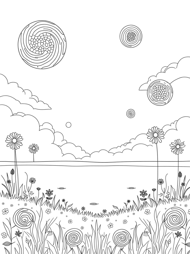 Up front, there’s a circular garden bursting with spirals and concentric shapes. It’s like an invitation to dive into a world of rhythm and color! Kids can let their imaginations run wild as they choose colors for the flowers, the lake, and each unique circle. This page is all about creativity and fun, perfect for hours of coloring!
