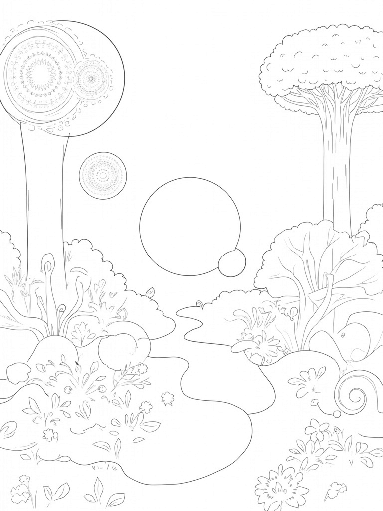 This scene is all about a magical garden where oversized floating circles dance in the air. Each circle has its own unique mandala design, making them super fun to color. Below, spiraling vines wrap around circular stones, creating a whimsical path that leads to a giant sunburst circle at the center. You can also spot delicate flowers shaped like circles, with petals that look like ripples, adding an extra touch of charm.