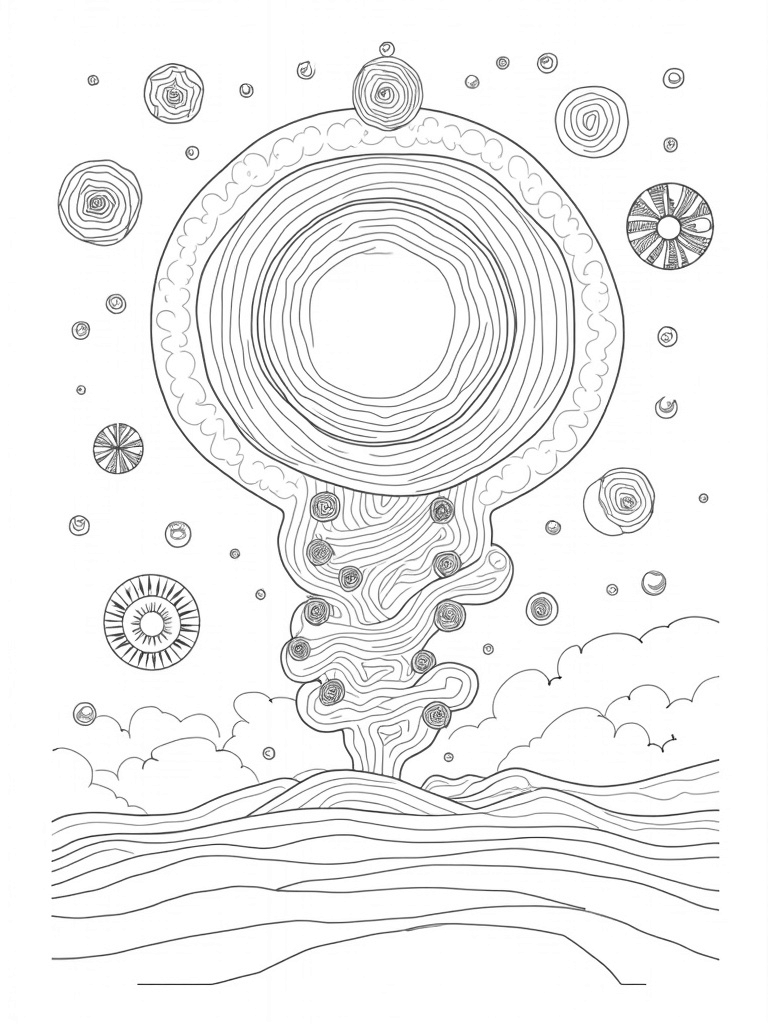 Surrounding this captivating scene, you'll spot circles of the sun and moon gently rotating. They cast playful shadows on the wavy ground below, making everything feel alive. This coloring page is perfect for anyone who loves to get creative and explore their imagination through art!