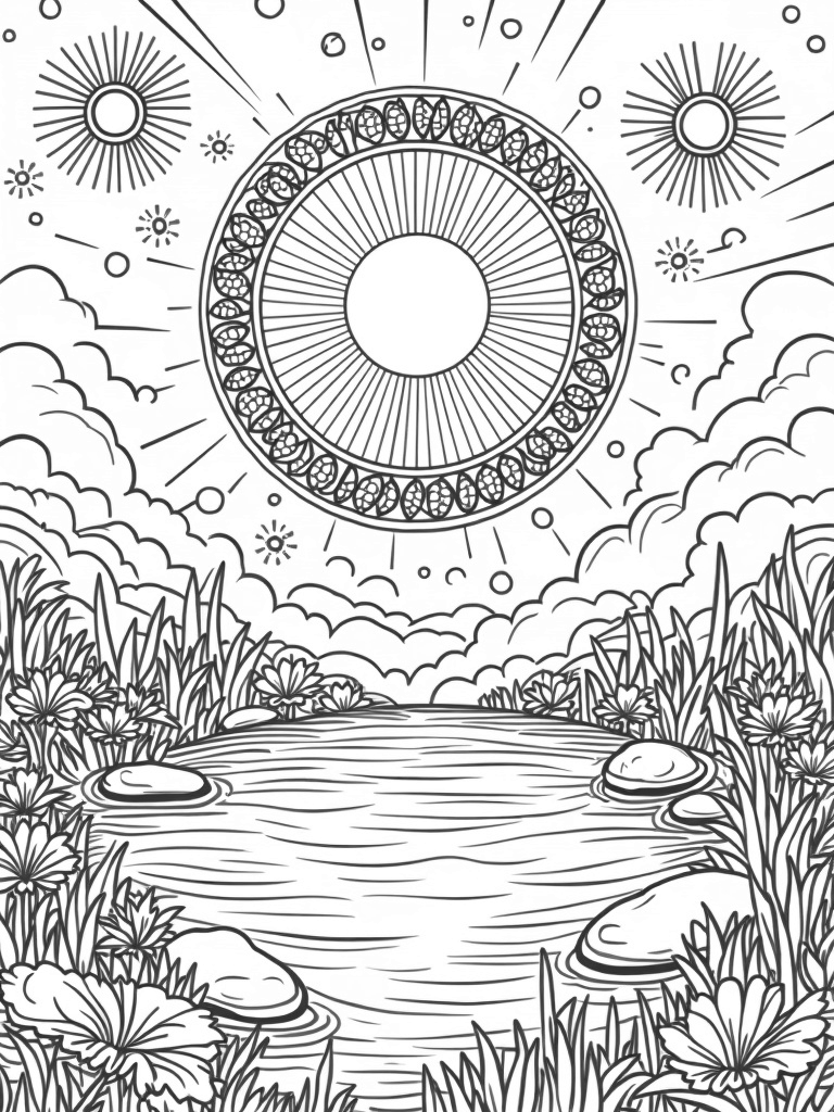 A ring of delicate flowers encircles the pond, each petal shaped softly and rounded, just like everything else in this dreamy world. It’s a lovely reminder of how nature combines shapes in such beautiful ways, waiting for you to bring it all to life with color!