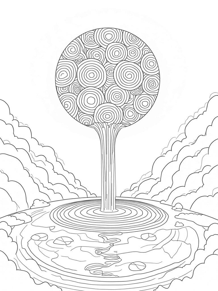 In the foreground, giant abstract circles act as stepping stones, guiding you toward the enchanting island above. The whole scene is framed by swirling clouds, adding a dreamy touch to this vibrant world. Grab your colored pencils or markers and let your imagination run wild as you bring this colorful landscape to life!