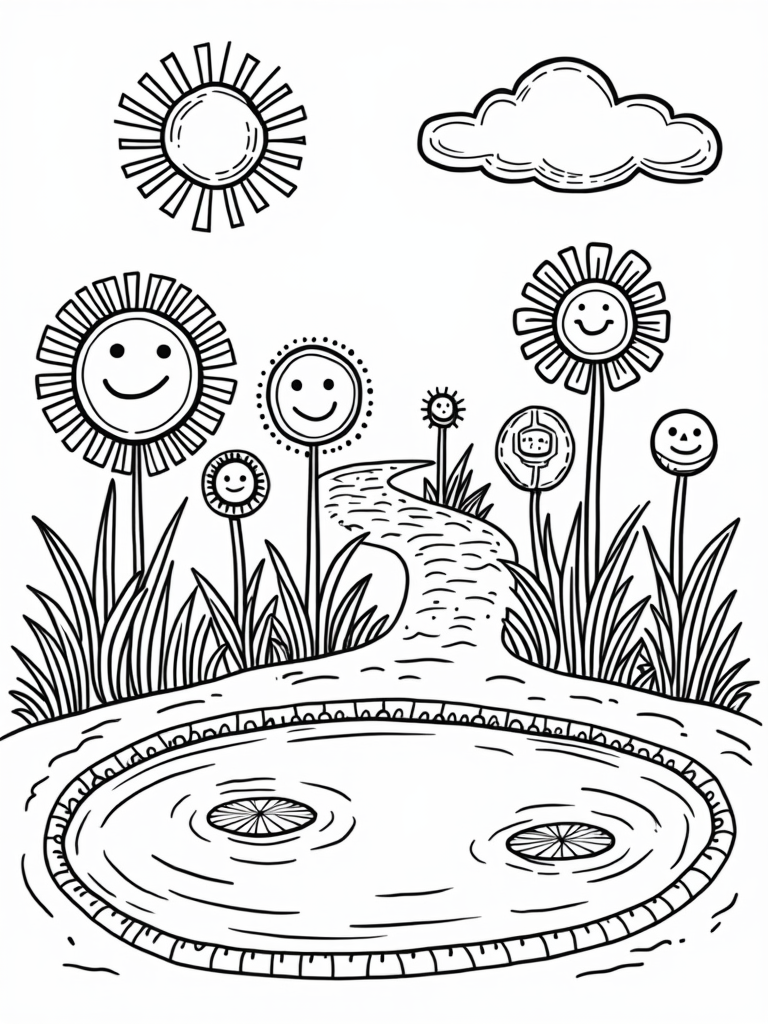 Nearby, there's a circular pond that reflects all the vibrant colors around it. Floating lily pad circles add to the charm, making it feel like a magical place. And let’s not forget the fluffy, circular clouds lazily drifting above—perfect companions for this joyful garden scene. Grab your crayons and get ready to bring this whimsical garden to life!