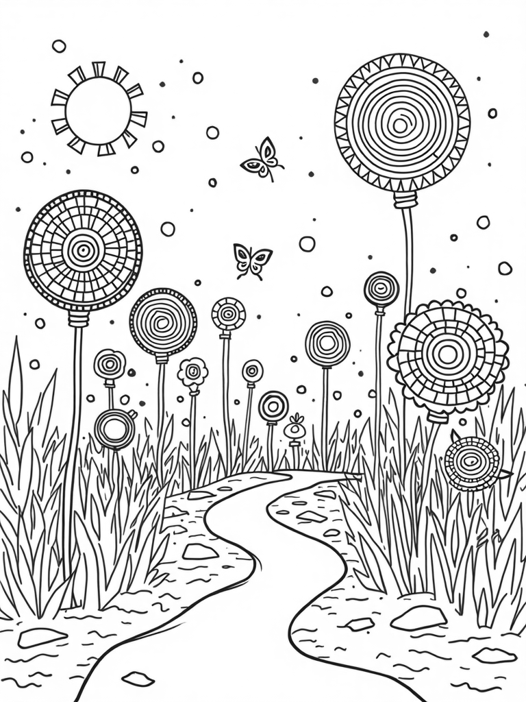 As you make your way through the scene, you'll find a winding path made of mosaic circles. Each step on this path takes you deeper into a world of imagination. In the background, there's a sunny sun made of concentric circles, casting fun shadows that dance across the garden. Don't forget to color the delicate butterfly circles fluttering by, their wings filled with geometric shapes that will inspire your creativity!