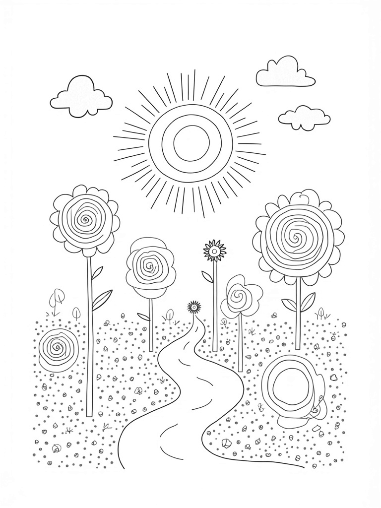 This playful garden is full of giant circles that look just like blooming flowers! Each colorful circle has its own unique patterns, like spirals and polka dots, making the whole scene feel alive and vibrant. Right in the center, there’s a big sunny circle with concentric rings that casts fun shadows all around.