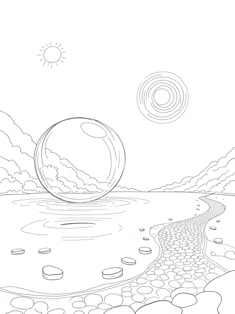 Check out this free, printable coloring page featuring a giant floating bubble, perfect for kids who love circles! Dive into coloring the serene lake, whimsical vines, and the unique sun. It's a fun way to spark creativity and enjoy some relaxing time with crayons or markers.