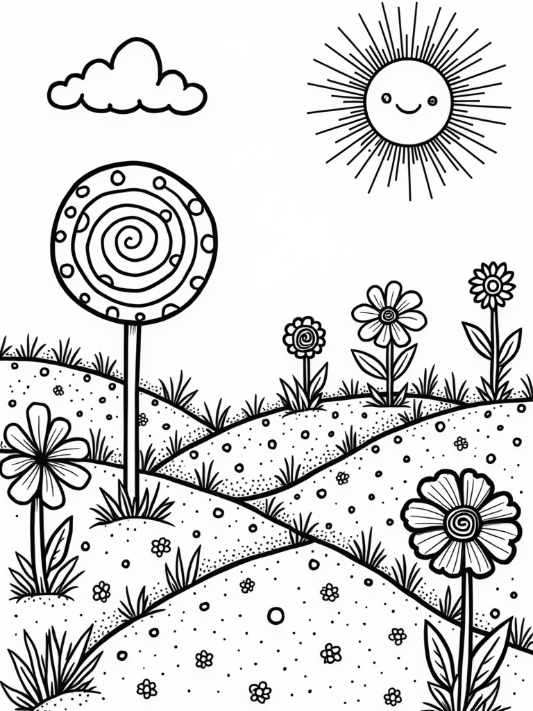 The rolling hills are alive with circular flowers that bloom in vibrant colors, each showcasing a unique spiral design at their centers. And let’s not forget the cheerful sun peeking out in the background, with a smiling circle face and swirly rays extending outwards, creating a joyful vibe all around.