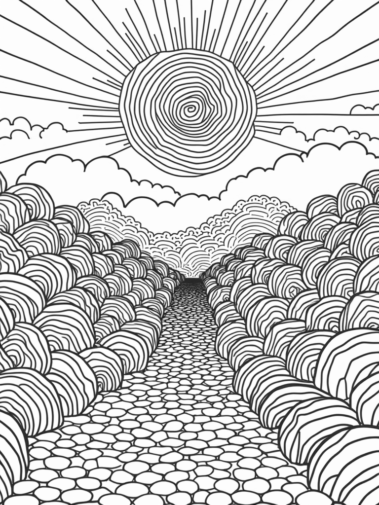 At the center of it all is a giant sun made of concentric rings. Its rays stretch out, lighting up the entire scene and inviting you to fill it with your favorite colors. Imagine coloring in the sun with bright yellows and oranges, then choosing cool blues and greens for the waves and geometric shapes!