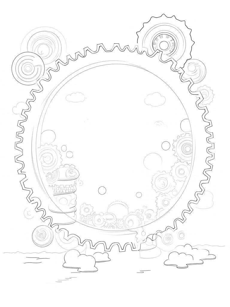 You’ll find a giant circle made up of interlocking gears, each one filled with its own unique patterns and textures. It’s like a mechanical masterpiece! Surrounding the main gear are floating, translucent circles of all sizes that create a dreamy effect, casting soft shadows below. Can you imagine how fun it would be to color in all those details?