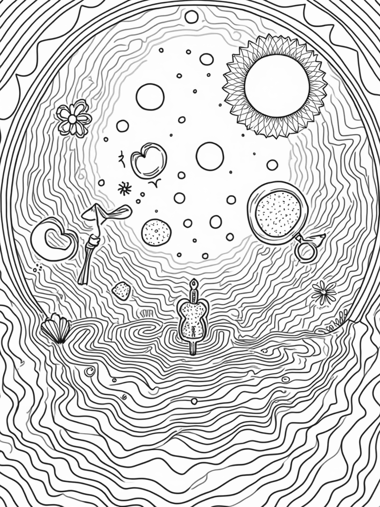 This vibrant dreamscape is all about circles! At the center, you'll find a large circle filled with intricate patterns and spirals just waiting for your favorite colors. Surrounding it are smaller circles that each hold their own little scenes, like a bright sun, a serene moon, and a lovely blooming flower. It’s like a magical world where everything connects!