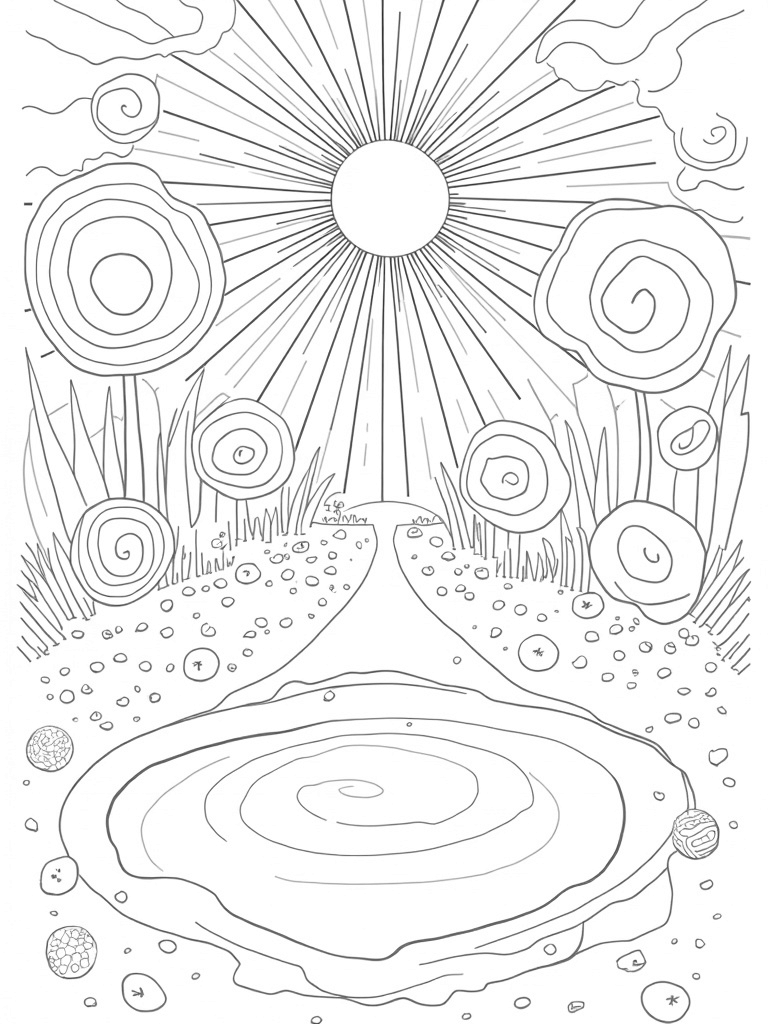 Imagine a garden where every flower is a vibrant circle! This coloring page showcases a kaleidoscopic garden filled with oversized circles that look like colorful blooms. You'll see towering petals that fan out, creating a layered look. Right in the center, there's a giant sun-shaped circle with intricate rays that cast fun shadows. Beneath all these cheerful shapes, a winding path made of dotted circles leads to a peaceful pond, where ripples create lovely concentric circles on the water's surface.