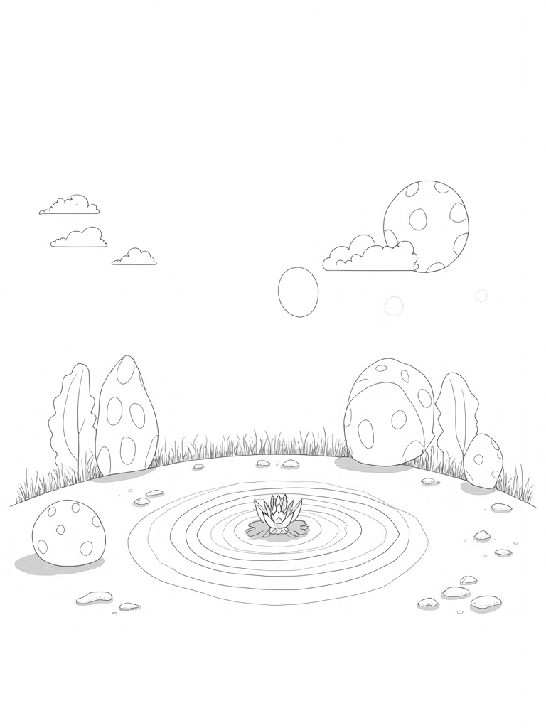 You’ll find a delightful forest clearing filled with oversized circles that are just waiting for your favorite colors! Look up to see large, polka-dotted spheres floating gracefully above the grassy ground, casting fun shadows below. Nearby, a beautiful mandala made of colorful pebbles creates a lovely pattern on the earth, inviting you to add your own touches.