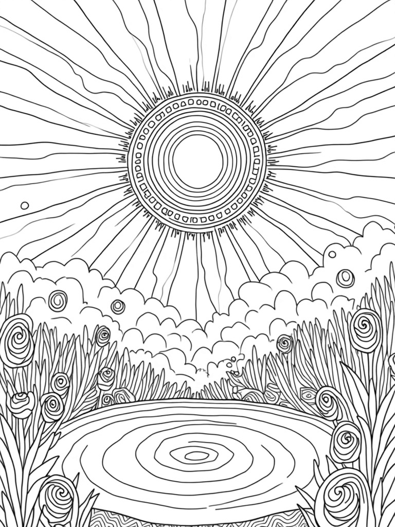This coloring page showcases a whimsical garden filled with oversized circles, each bursting with fun patterns like spirals, dots, and waves. At the heart of it all, there’s a giant sun-shaped circle that sends out beams of smaller circles, creating a vibrant mandala effect. Below, a serene pond ripples with perfect concentric circles, while blooming circular flowers with layered petals add pops of color to the scene.