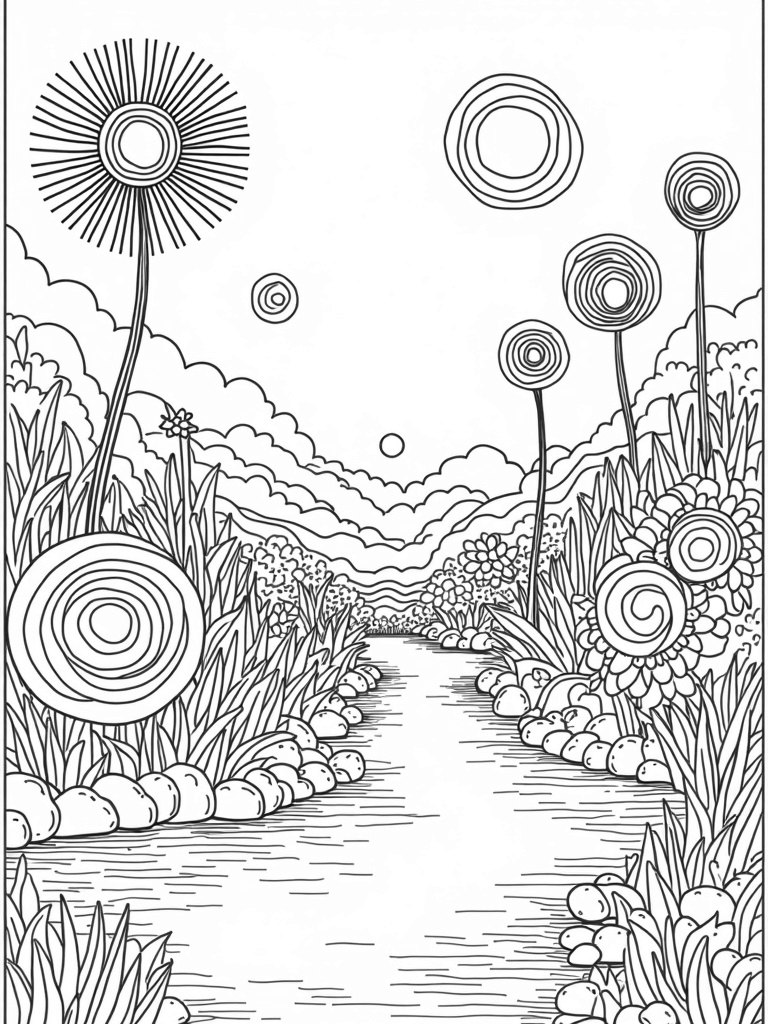 In the background, you’ll find a winding path of concentric circle stones leading off into the distance. It’s dotted with towering spiral trees that add a whimsical touch to this magical scene. Each section of this coloring page offers a unique opportunity to explore different colors and patterns. Let your imagination run wild as you fill in each circle!