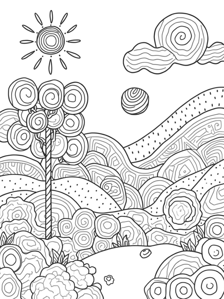 Oversized Circles and Vibrant Flowers in a Whimsical Landscape Coloring Page