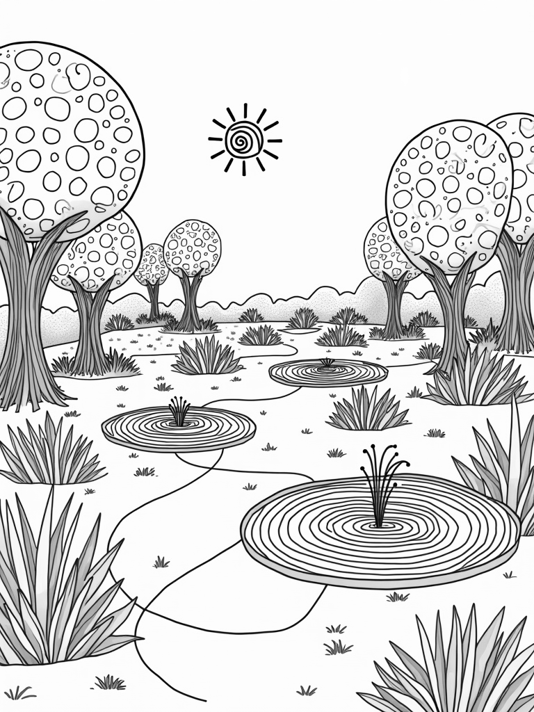 As you look closer, you'll notice a winding path made of smaller circles leading to a whimsical fountain. The fountain is special because the water spirals upward in perfect circular arcs, creating a magical effect that will inspire your creativity. And check out the trees in the background! Their circular leaves sway gently in the breeze, and their trunks twist into fun shapes as they reach for the sky.