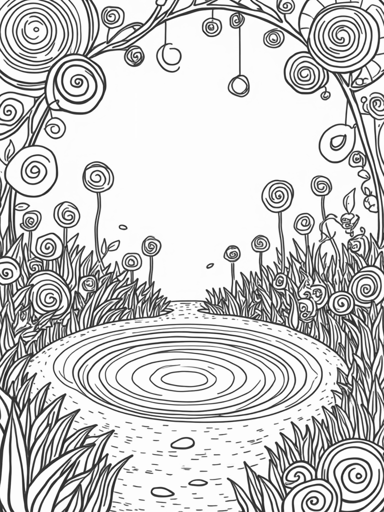 In the heart of this enchanting garden is a serene zen garden made of smooth pebbles, spiraling into a calming design. Tiny raked lines lead to a peaceful pond shaped like a perfect circle, reflecting all the vibrant circles above. It’s the perfect spot to relax and let your imagination run wild while you color!
