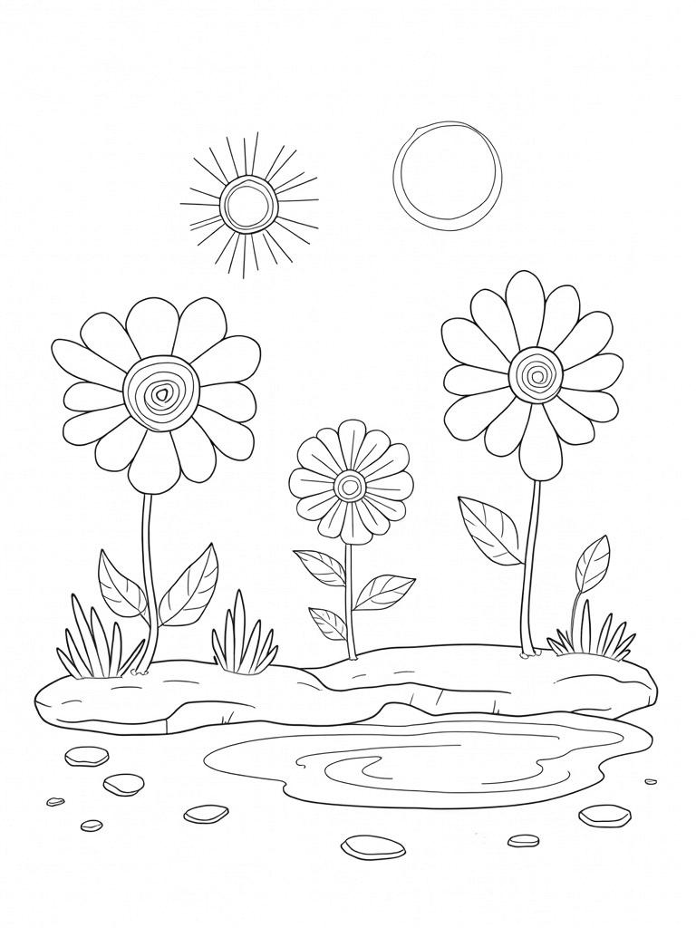 This scene is all about oversized geometric flowers with vibrant circular petals that are just waiting to be filled with color! The petals come in all sorts of sizes, making the flowers look even more playful. Right in the center, there's a big sunburst made of concentric circles that seems to radiate warmth and joy. Don't forget the spiraling vines that weave through everything, adding a touch of whimsy.