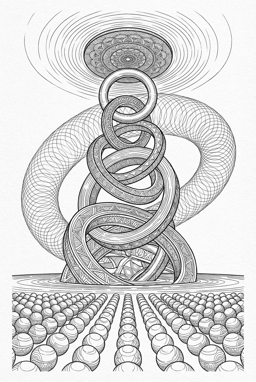 Look at a massive spiral built from interlocking rings that climb up from a flat plain. Each ring is drawn with a thick, bold line that loops back on itself, creating a fun, maze‑like pattern. Right at the tip, a floating disc sits, etched with mandala‑style designs that send out concentric waves. Around the base, you’ll find a tidy grid of perfect spherical stones, each one catching the curve of the rings like tiny mirrors. A faint vortex of swirling circles wraps around the whole scene, its edges fading into the background for a dreamy feel.