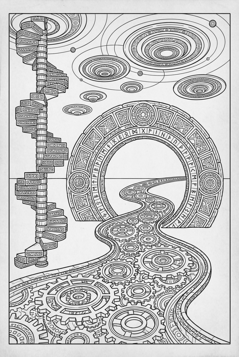 Try giving the arch a stone‑gray vibe with a mix of cool blues and purples for a twilight feel. The ring river works great in alternating shades—maybe a bright teal followed by a sunny yellow—to show the flow. For the staircase, think of a gradient that gets lighter as it climbs, and let those floating disks be a splash of pastel rainbow colors. Play around, and don’t worry about staying inside the lines; it’s all about having fun!