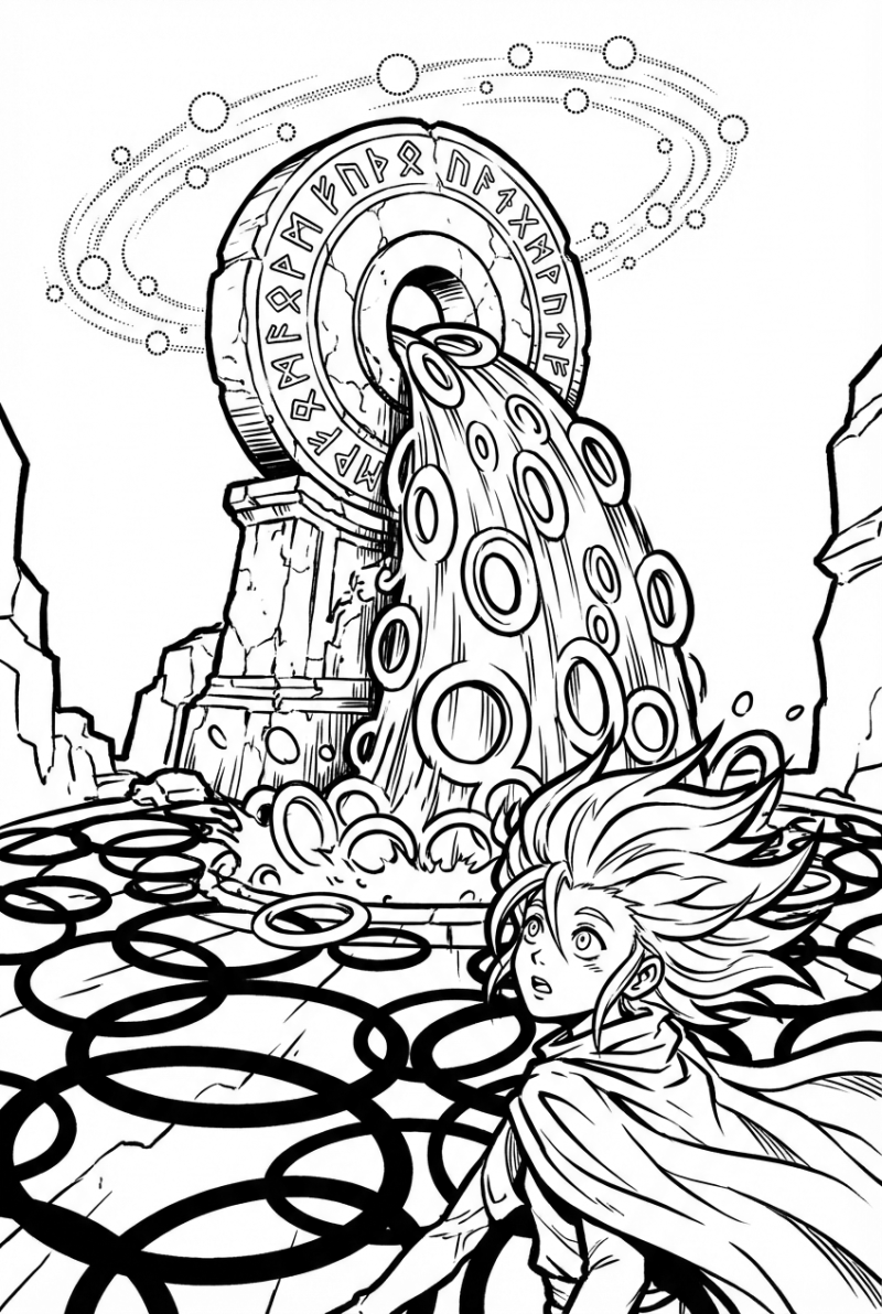 Look at that huge stone disc perched on a tall pedestal. From its edge a set of rings rolls outward like a slow‑moving waterfall, and tiny circles hover around it like a little halo. Beneath everything is a circular mosaic floor made of interlocking hoops that adds a fun geometric base.