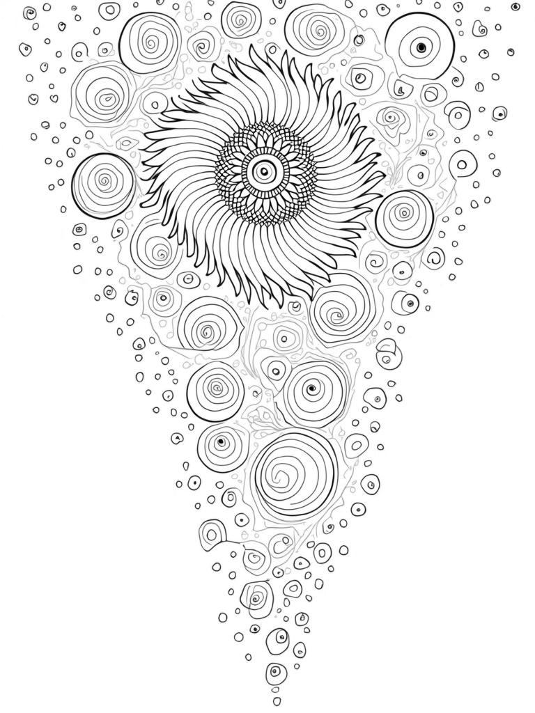 You’ll find a swirling vortex filled with colorful circles of all sizes. Some look like bubbly balloons, while others burst open to reveal beautiful mandala patterns, like a flower in bloom! Each circle is unique, with stripes, polka dots, and spirals that will make your crayons dance with joy.