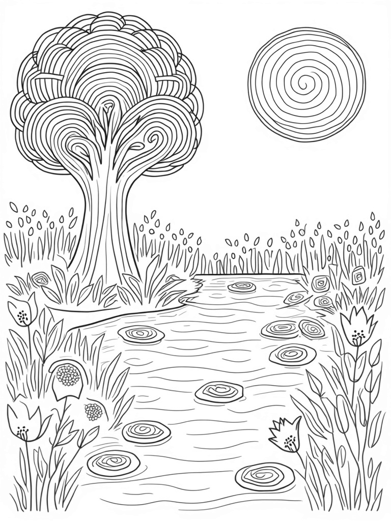 This scene is all about fun shapes and colors! You’ll see a gigantic circle tree in the middle, with its leaves fanning out like giant umbrellas. The garden is filled with oversized circles, each hiding intricate patterns just waiting for your creativity. There’s even a winding path made of concentric circles that leads to a shimmering pond, where circular lily pads float peacefully.