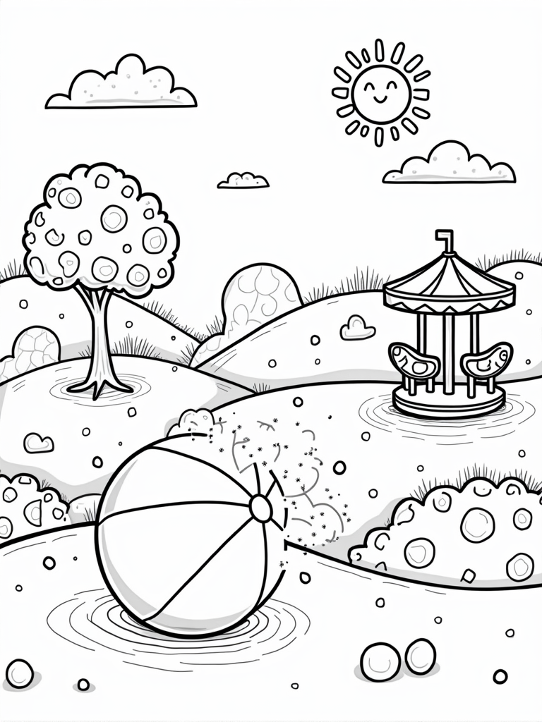 Vibrant Playground with Giant Beach Ball and Merry-Go-Round Coloring Page