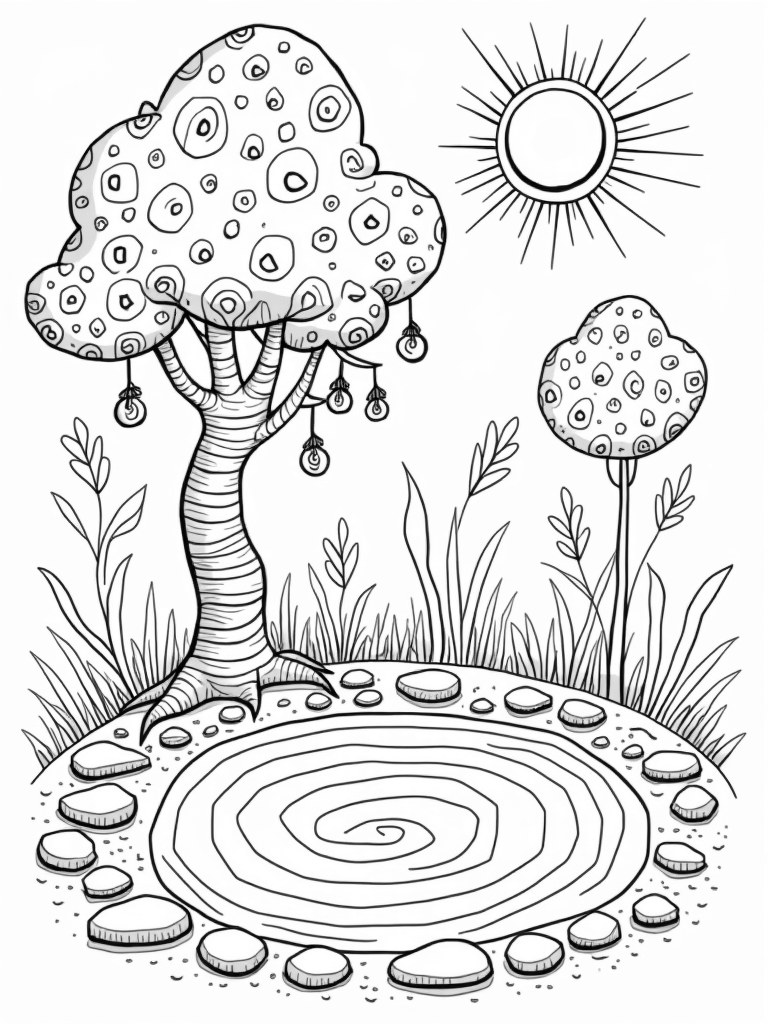 At the base of this enchanting scene, smooth pebbles form cozy concentric circles around a small pond. You can almost imagine the water reflecting all those fun shapes above it! And don’t forget about the friendly sun in the distance, sending out playful rays that dance with the patterns below. This page is perfect for sparking creativity!