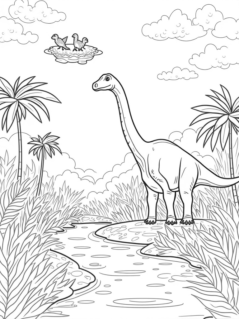 Brachiosaurus and Raptor Playtime in a Prehistoric Jungle Coloring Page