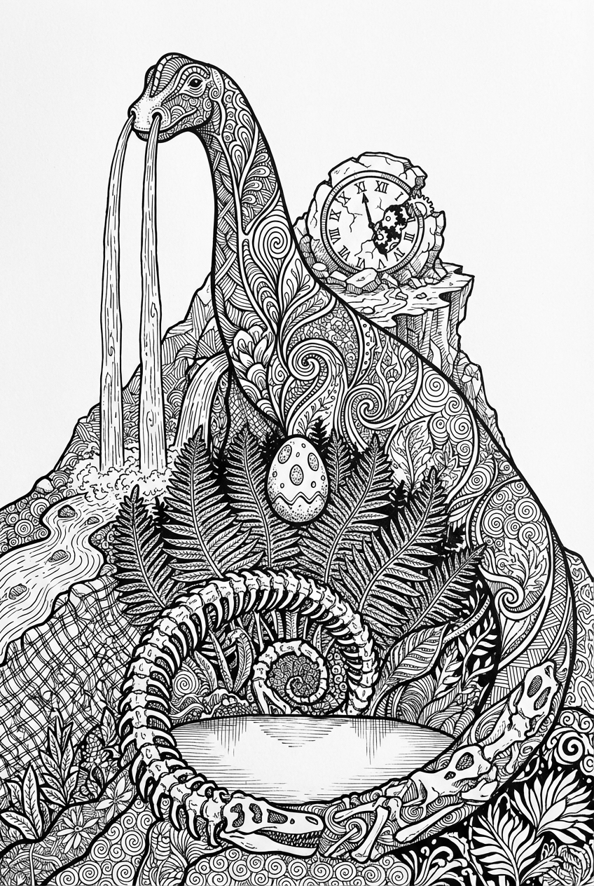 Did you know brachiosaurus had a really long neck that let it reach high canopy trees? The waterfalls are just a fun twist – imagine real water pouring out of a dinosaur’s nose! The stone clock is a nod to ancient time‑keeping, and the egg hints at the mystery of how dinosaurs hatched. Those bone arches look like nature’s own picture frame, giving the lake a magical border.